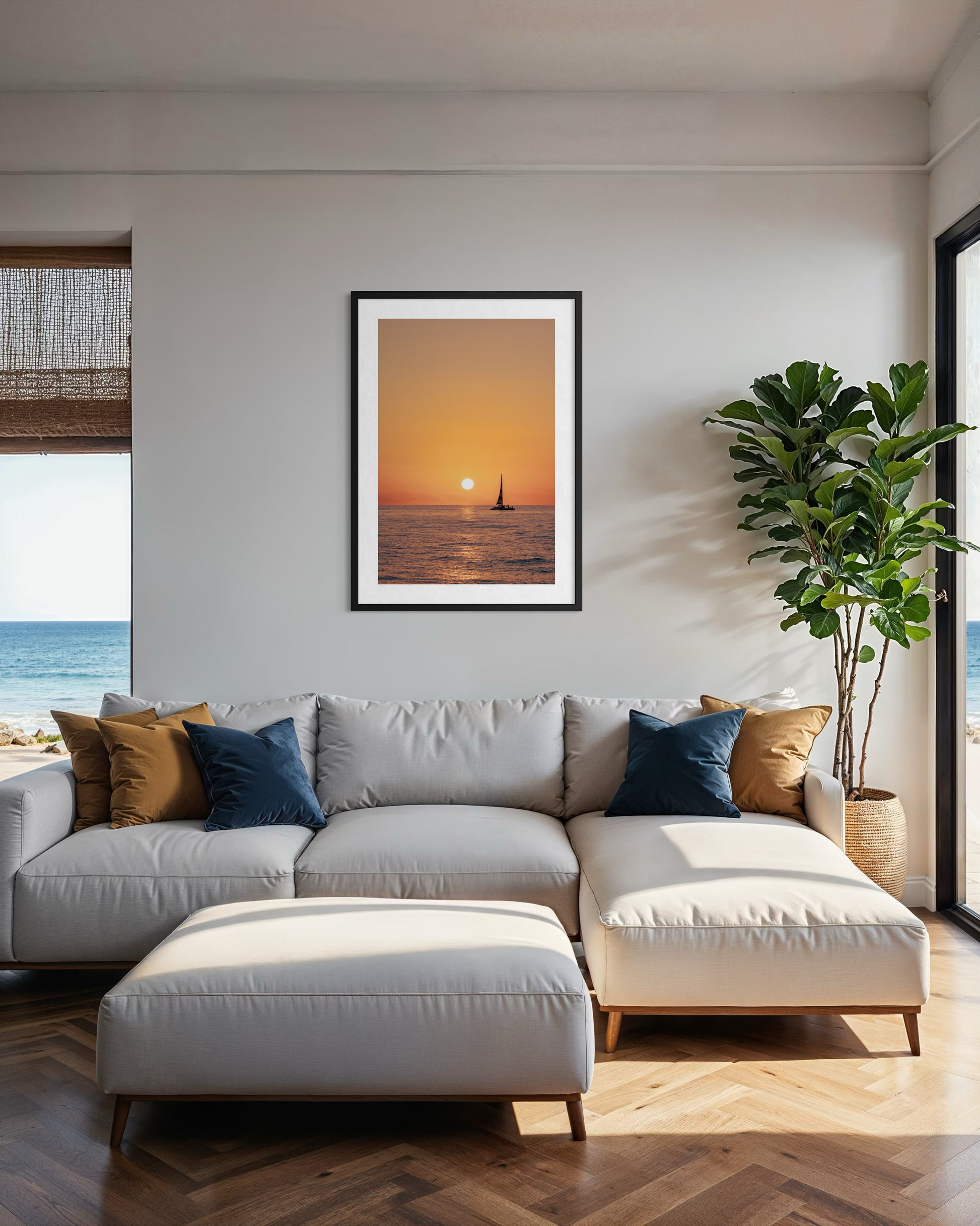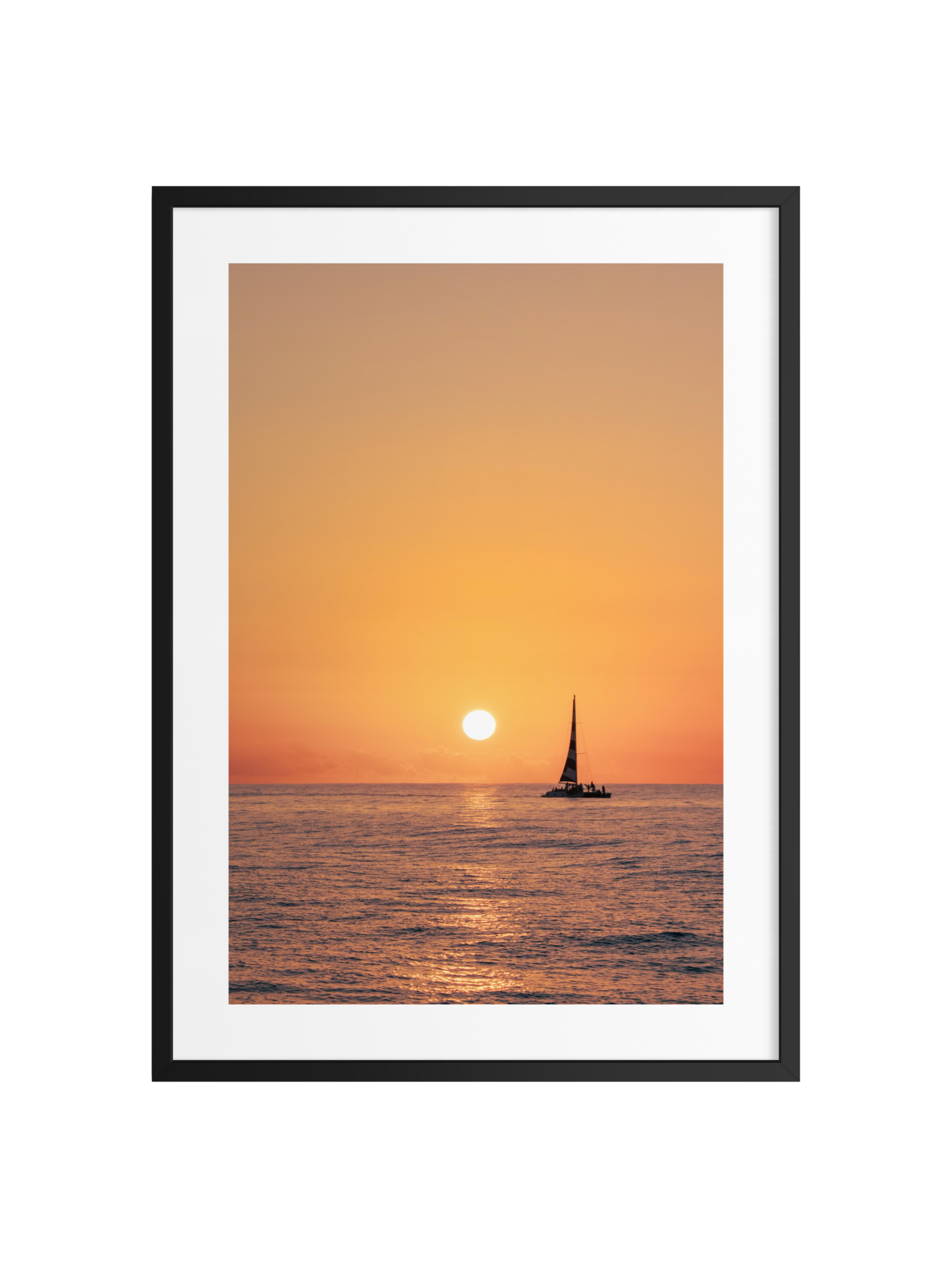 Capture the stillness of the Pacific. This fine art print features a lone sailboat silhouetted against a vibrant Oahu sunset, bringing a sense of warmth and modern serenity to any room.